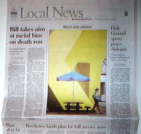 From yesterday's Pittsburgh Post-Gazette. Underline, exactly on the fold: "Dana A. of Brockway, a senior at the University of Pittsburgh, leaves a bench Sunday to enter Wesley W. Posvar Hall."